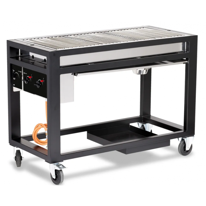 Der Gasgrill Europa verfügt über ein komplett schwarz epoxidbeschichtetes Rahmengestell mit vier Rollen (2 davon Lenkrollen) und einem sicheren Gasflaschenhalter.