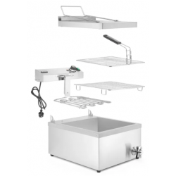 Komplett aus Edelstahl, mit zwei Rosten (354x383mm) mit Cool-Touch-Griff, einem Heizschutz und einem Deckel, der auch als Auffangwanne dienen kann.